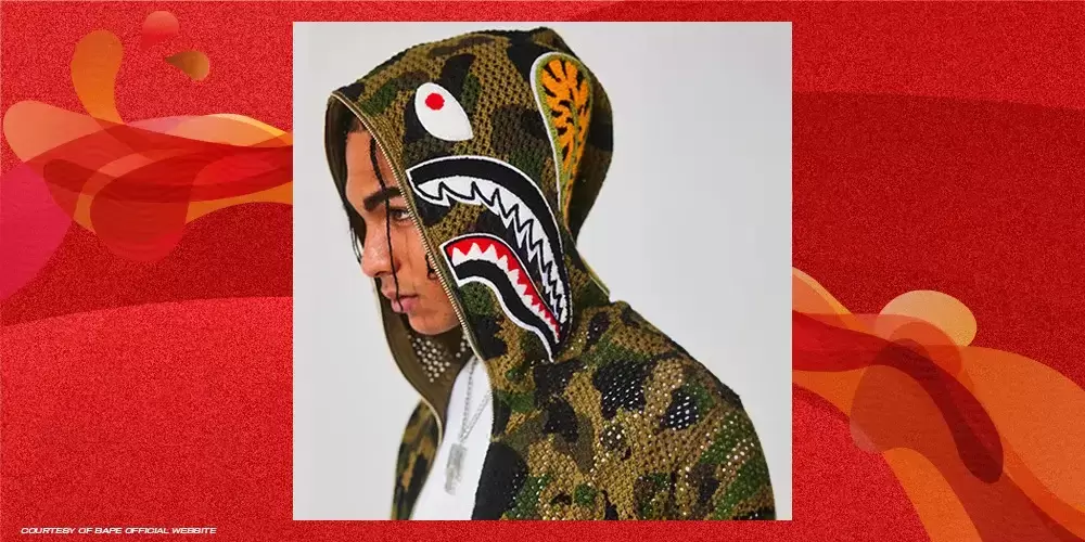 Enggak kalah sama varsity jacket di bagian sebelumnya, hoodie baru keluaran Bathing Ape buat edisi Spring/Summer 2024 juga berani abis! Misalnya aja, di camo hoodie-nya, lo bisa ngelihat graffiti monster hybrid antara hiu sama macan. Yang kayak begini sering ada di graffiti buat nunjukin identitas garang, makanya gue bisa rekomendasiin hoodie satu ini kalau lo mau bikin penampilan lebih edgy!
