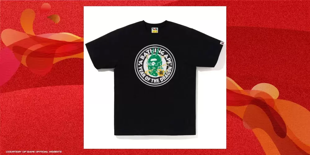 Last but not least, Bathing Ape juga enggak ketinggalan ngerilis graphic tee buat nyambut tahun 2024 yang identik sama shio naga. Ini keliatan banget dari logo BAPE yang digabungin sama tanduk naga plus warna hoki buat tahun ini, which is hijau tua ngikutin sisik naga. Karena warnanya dominan hitam yang netral, lo bisa banget mix and match sama fashion item lain yang lebih eye-catching, Bro!